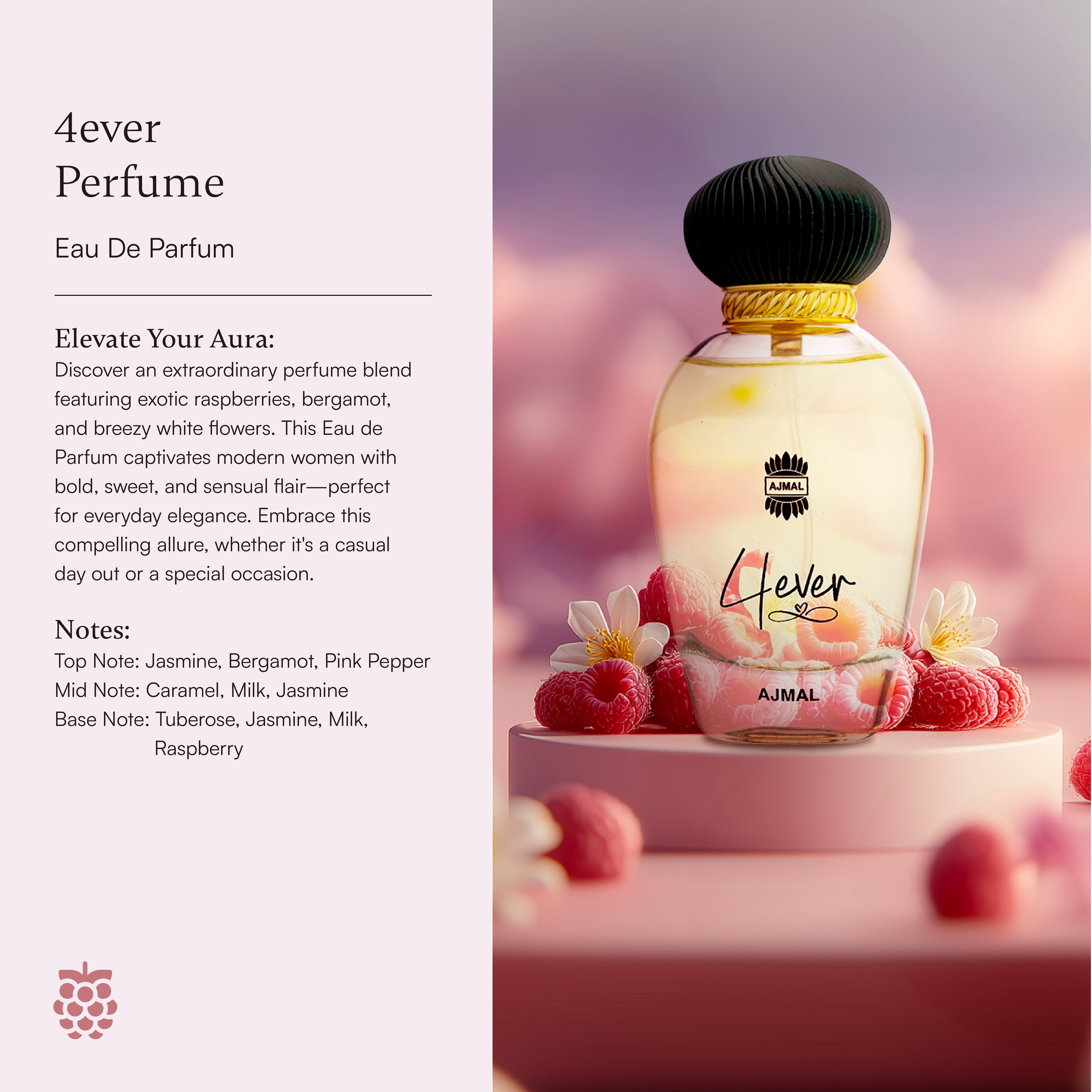 🩷 4ever (สำหรับคุณผู้หญิง): สัญญาว่าจะรักกัน "ตลอดไป" กลิ่นหอมหวานละมุนจากคาราเมล นม และราสเบอร์รี่ ผสาน ดอกไม้ ขาว ให้ความรู้สึก น่ารัก เย้ายวน และน่าทะนุถนอม