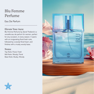 น้ำหอม Blu Femme โดย Ajmal Thailand เป็นน้ำหอมผู้หญิงติดทนนาน โอ เดอ พาร์ฟูมที่เหมาะกับทุกโอกาสและทุกฤดูกาล เปิดตัวด้วยกลิ่นสดชื่นแบบดอกไม้ ตามมาด้วยกลิ่นกลางหอมหวานจากดอกไม้ปนกลิ่นไม้ และปิดท้ายด้วยกลิ่นเบสอบอวลจากไม้และมัสก์ ในแบบฉบับ Eau De Parfum