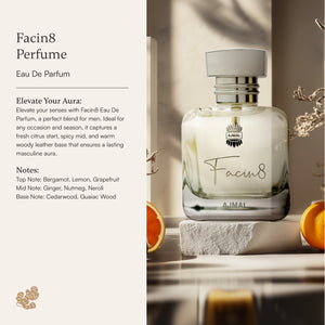 ยกระดับประสาทสัมผัสของคุณด้วย Facin8 Eau De Parfum เป็นน้ำหอมผู้ชาย โอ เดอ พาร์ฟูม ที่ผสมผสานอย่างลงตัว เหมาะกับทุกโอกาสและทุกฤดูกาล เปิดด้วยกลิ่นสดชื่นของซิตรัส ตามด้วยกลิ่นสไปซี่ และปิดท้ายด้วยเบสวูดดี้เลเธอร์อันอบอุ่น