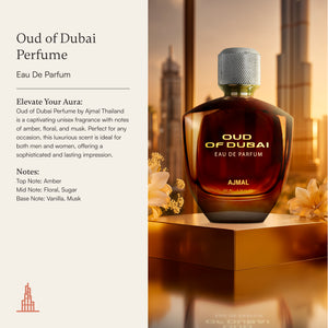 Oud of Dubai Perfume โดย Ajmal Thailand เป็นน้ำหอมติดทนนาน สำหรับทุกเพศ ที่น่าหลงใหลด้วยกลิ่นแอมเบอร์ ดอกไม้ และมัสก์ เหมาะสำหรับทุกโอกาส มอบความประทับใจที่หรูหราและยาวนาน